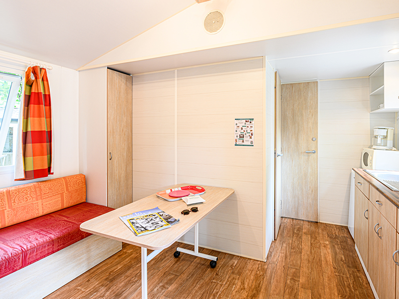 Een woonkamer met een eethoek. Elektrische verwarming alleen in de woonkamer. Wifi inbegrepen.